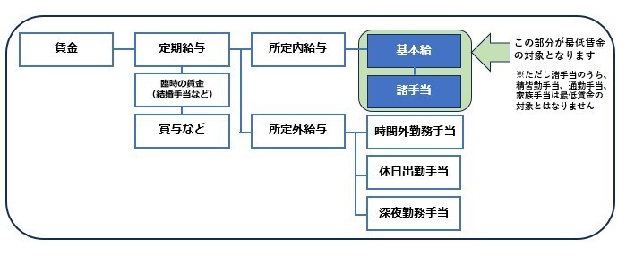 | 6 | 当該最低賃金において算入しないことを定める賃金 | 精皆勤手当、通勤手当及び家族手当など (除外の指定がある場合に限る) |