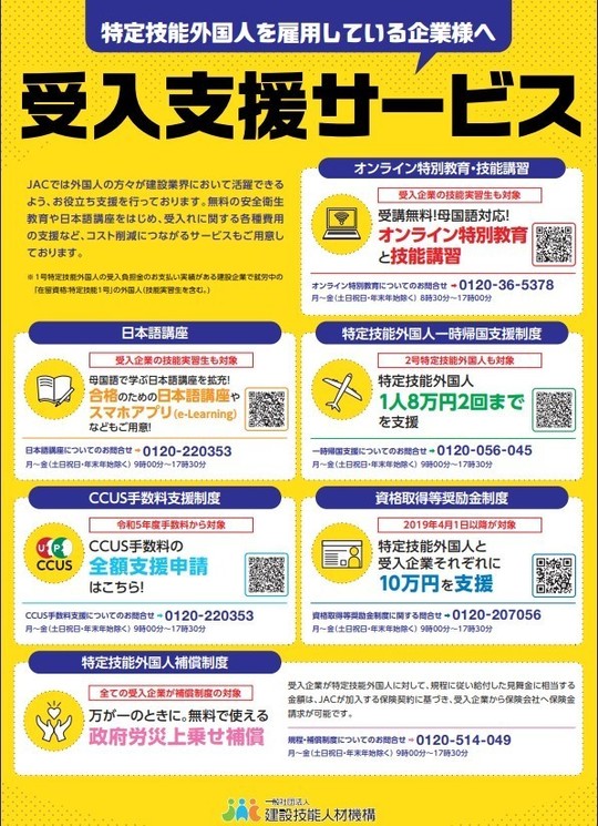 | CCUS手数料支援 | 管理者ID利用料について、一旦(一財)建設業振興基金(CCUS事務局)へお支払いいただき、後日JACより受入企業に全額返金いたします。 |