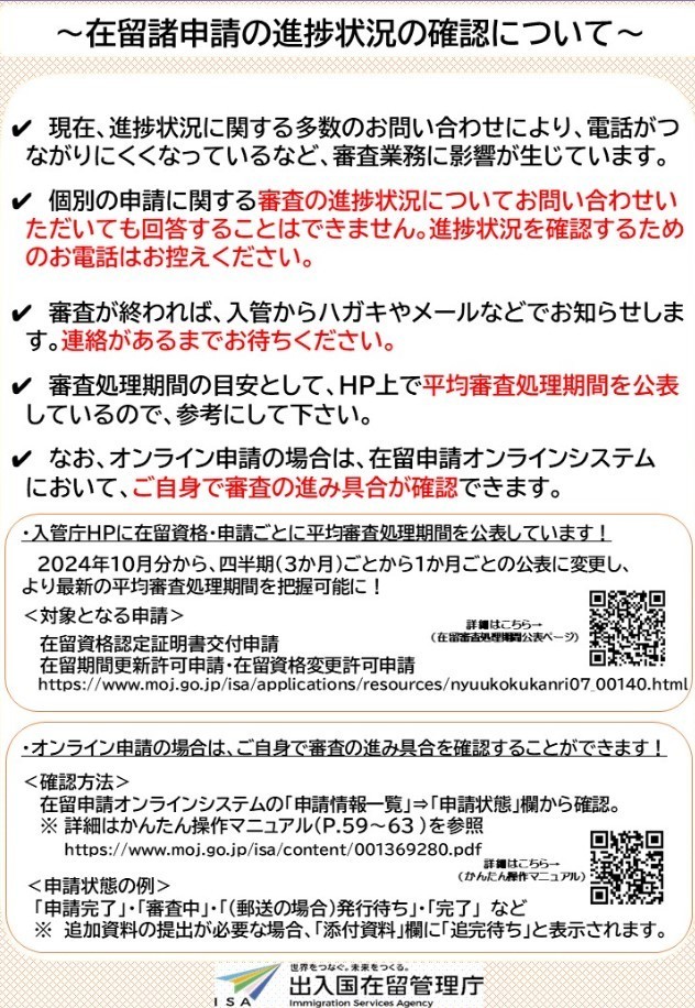 個別の申請に関する審査の進み具合、審査終了時期や処分結果の見通しにはお答えできません。 進捗状況を確認するためのお電話はお控えください。