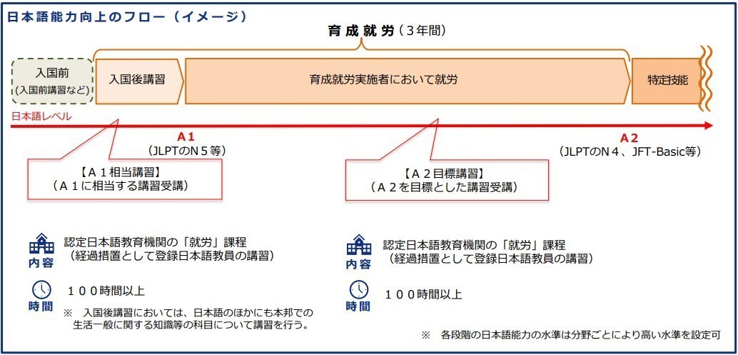 | 育成就労実施者の負担において、A2相当の日本語能力の試験に合格するため、3年間の育成就労期間中に 認定日本語教育機関の「就労」課程においてA2相当講習を100時間以上履修することがで きるよう必要な措置を講じる(※2、3)。 ※2 入国前講習・入国後講習におけるA2相当の認定日本語教育機関の「就労」課程において履修した授業科目の授業時間数を含む。 認定日本語教育機関:日本語教育課程を適正かつ確実に実施することが できる日本語教育機関である旨の文部科学大臣の認定を受けた日本語教育機関。一覧を公表中。 |