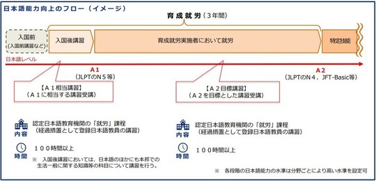 | 育成就労実施者の負担において、A2相当の日本語能力の試験に合格するため、3年間の育成就労期間中に 認定日本語教育機関の「就労」課程においてA2相当講習を100時間以上履修することがで きるよう必要な措置を講じる(※2、3)。 ※2 入国前講習・入国後講習におけるA2相当の認定日本語教育機関の「就労」課程において履修した授業科目の授業時間数を含む。 認定日本語教育機関:日本語教育課程を適正かつ確実に実施することが できる日本語教育機関である旨の文部科学大臣の認定を受けた日本語教育機関。一覧を公表中。 |