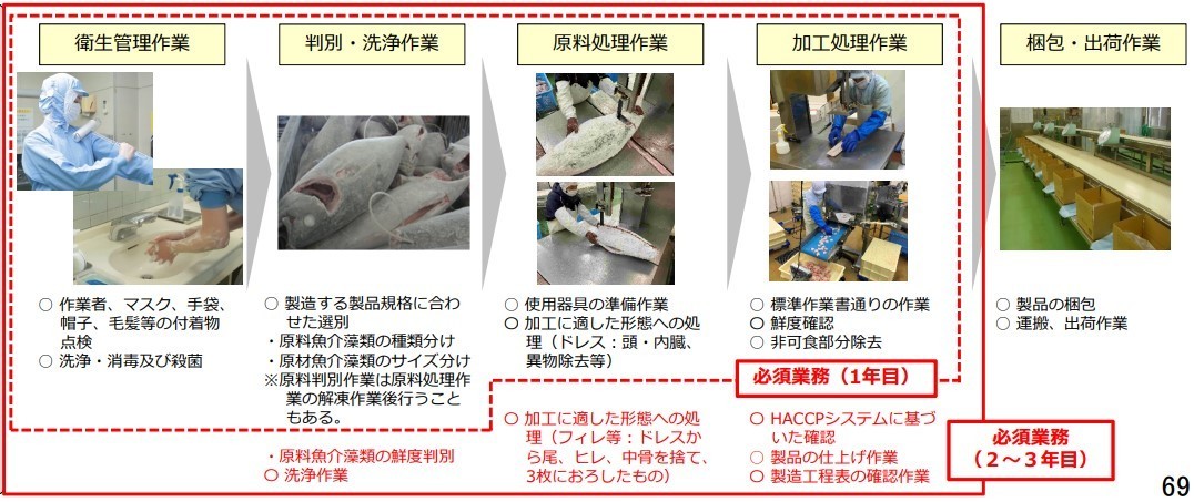 2~3年目 | 1年目で行う作業に加えて、加工処理作業において加工度の高い処理(2次加工:フィレ等)ができるようになる。 ※重要管理点(CCP)を設定し、そのモニタリングと管理記録・改善(是正)措置を行うこと |
